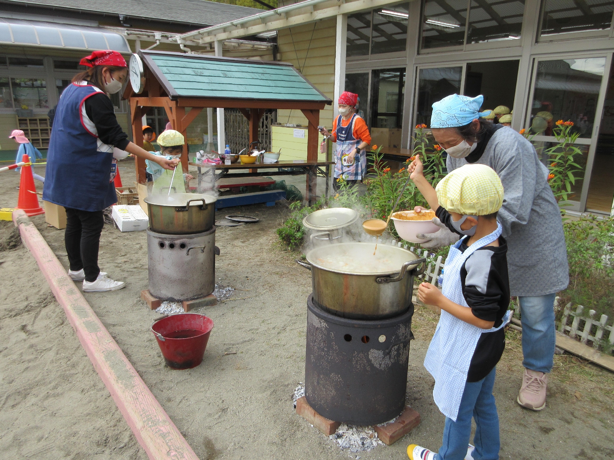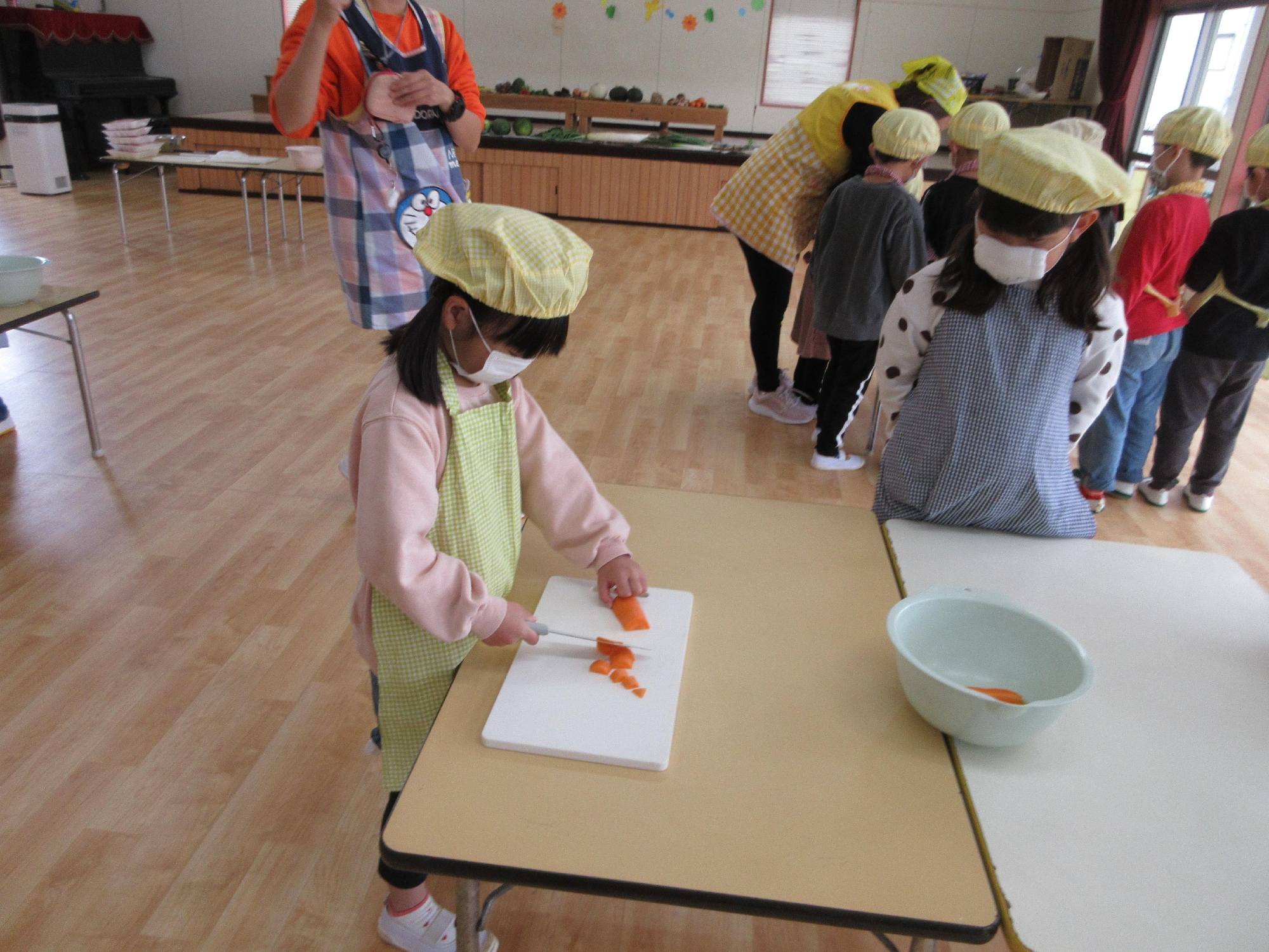 にんじん、だいこん、玉ねぎ、さつまいもを年長さんが切ってくれます。切った後はかまどに運びます。小さいクラスの机を運んだり、年長さんがみんなのために張り切ってくれました😊