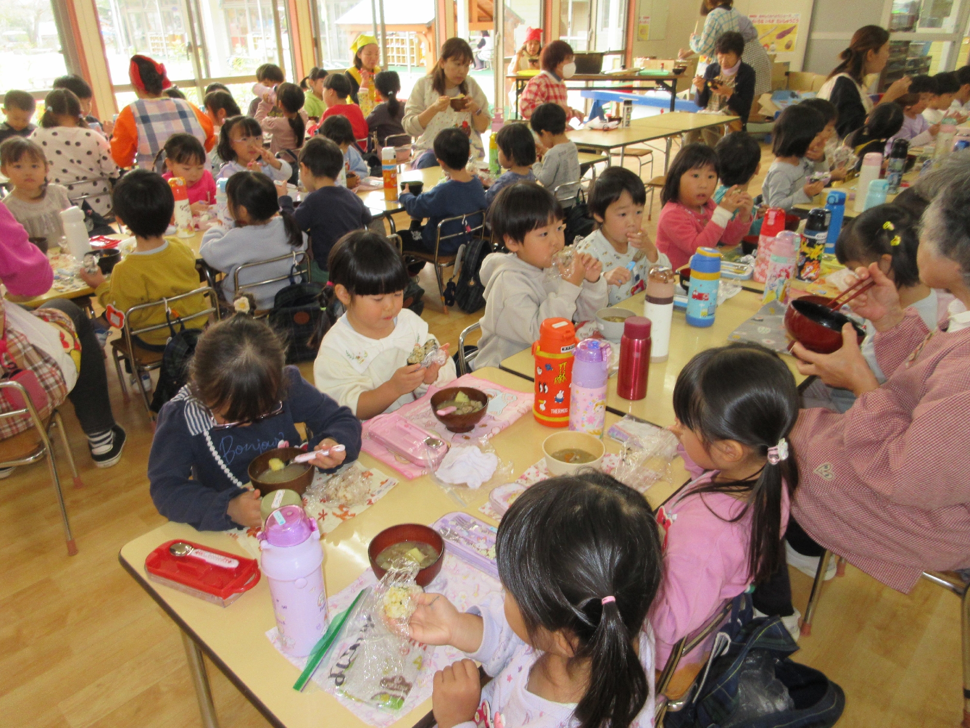 幼稚園の豚汁はさつまいも入り、最高に美味しいのです‼みんなでおいしい!おいしい!とおかわりをして大人気です。秋の恵みに感謝をしてお野菜をいっぱい食べました😊