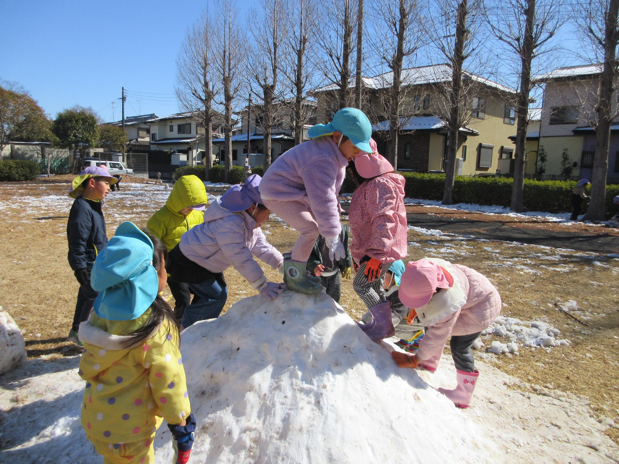 いっぱい雪が降りました!みんな、ゆきだるまを作ったり、雪、氷の感触を楽しんだり、ずっ~とワイワイ遊びました😊雪のすべり台は楽しい~‼