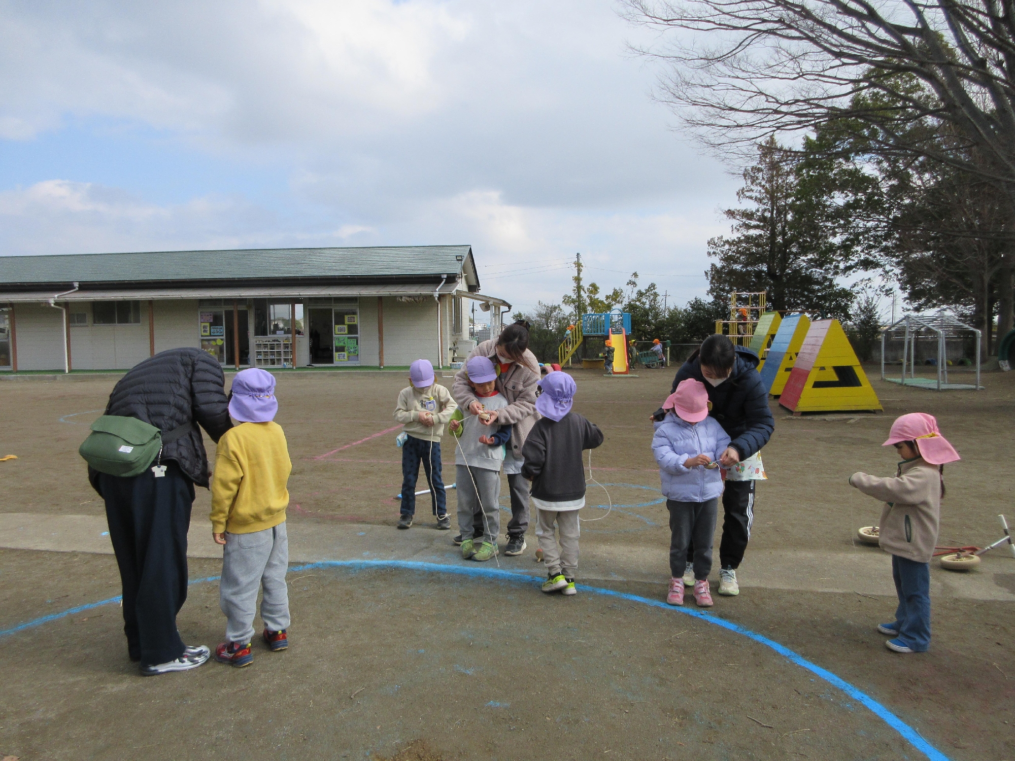 子供たち、こま回し好きなんです!なかなかうまく回らないけれど、繰り返しやってみてコツを掴んできました。誰が達人になれるかな?先生達も負けないぞ😊